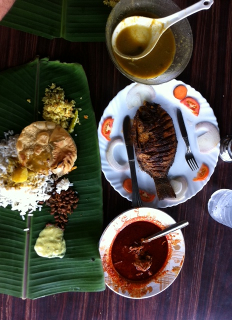 Viaje entre Kovalam y Allepey: paradita pa comer. Precio de un té, 7 rupias, es decir, 10 céntimos de euro!! Almuerzo para tres: 120 rupias, es decir, unos 2 euros . (Esto es en cuanto te sales del circuito turístico…)