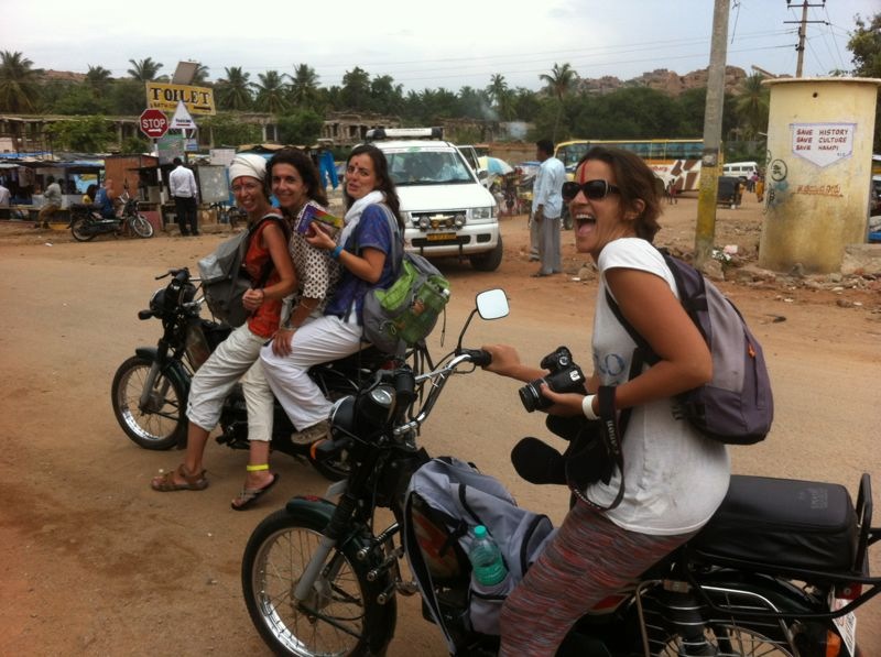 Moteando por Hampi con las colegas de la FVF, las tres que van en una moto (práctica muy habitual por aquí)
