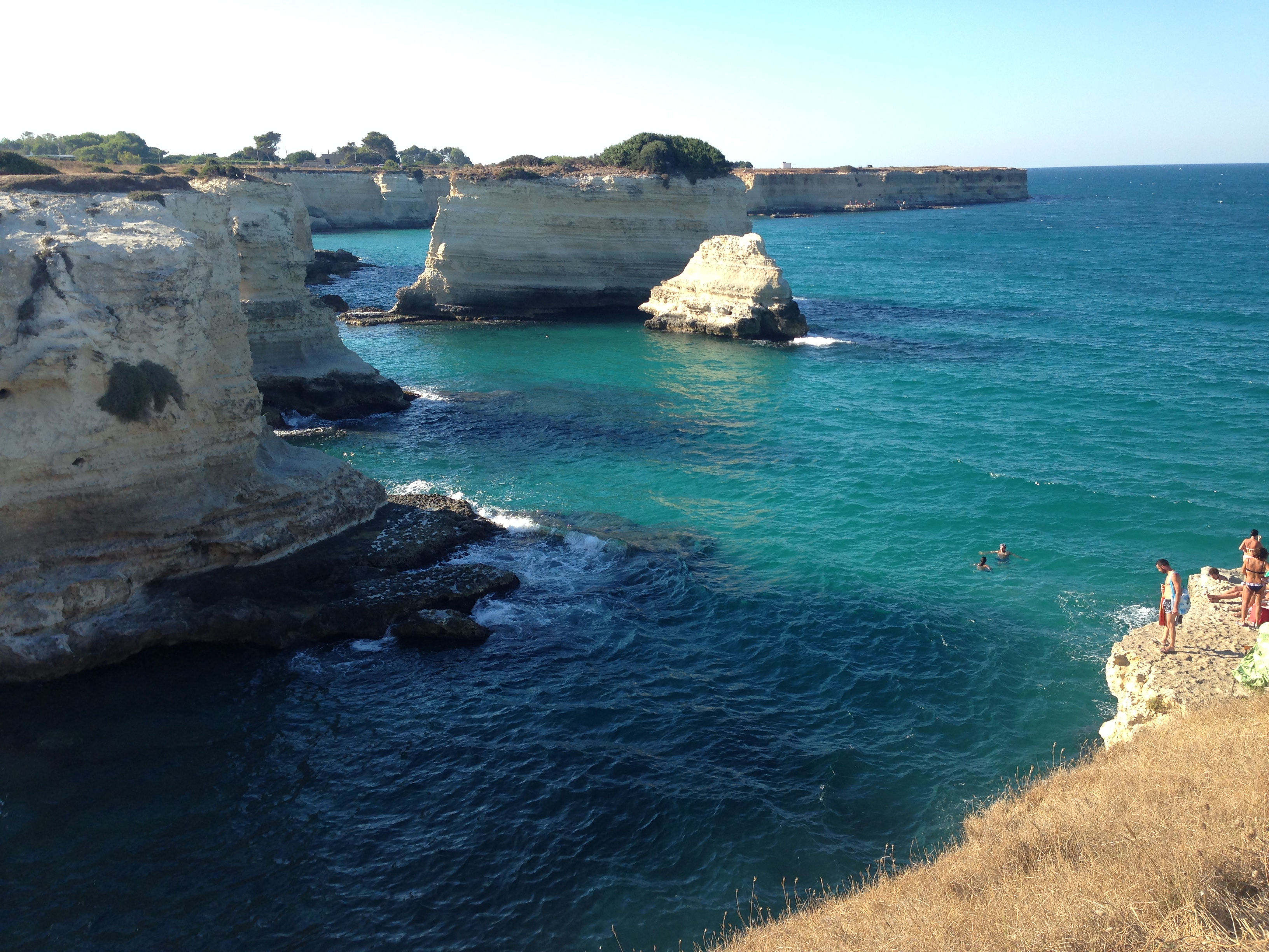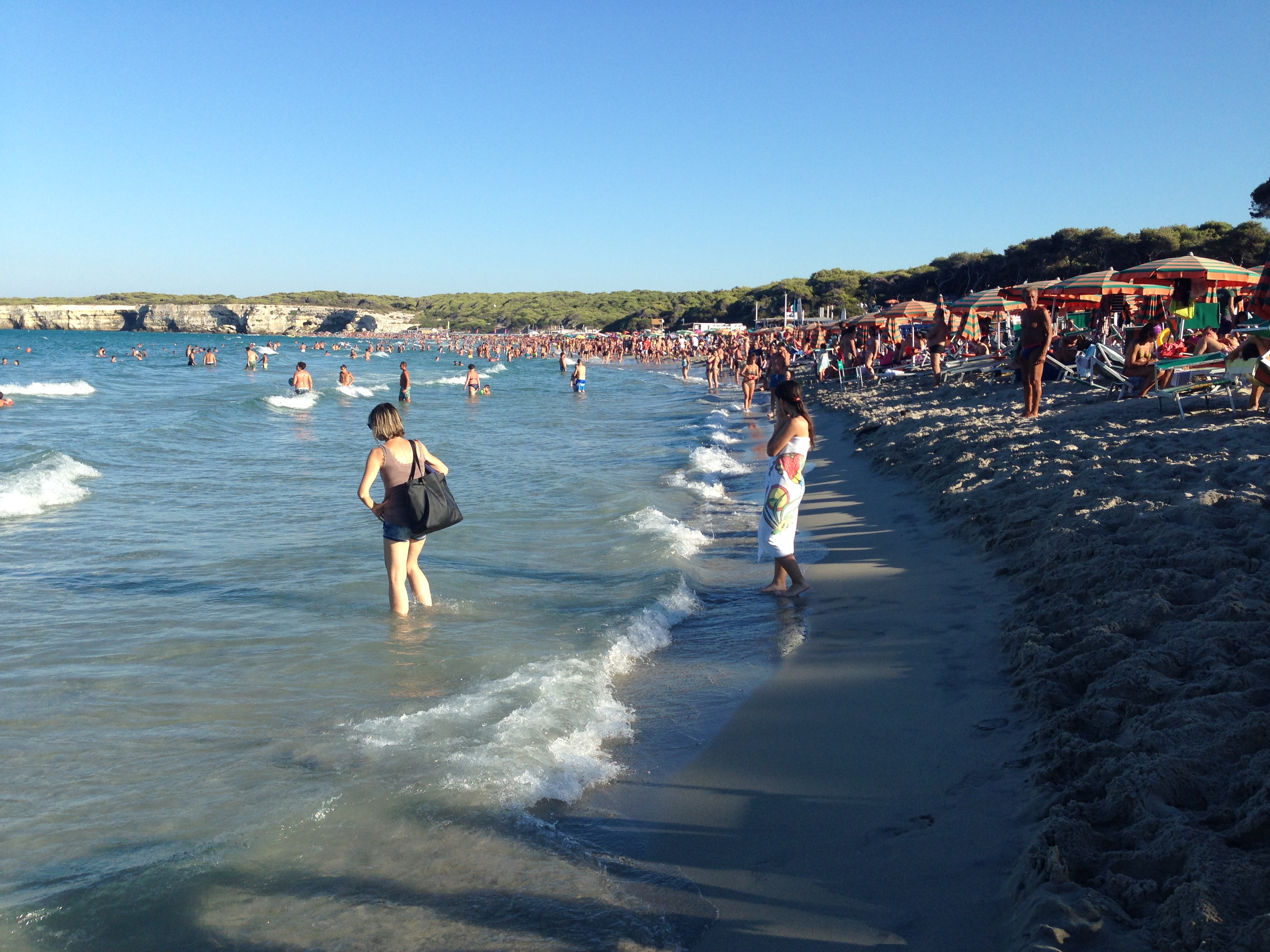 Y luego, rumbo a Otranto, donde por fin nos encontramos con Francesca, que nos ha acogido en su casa, en Martano. Francesca es amiga mía de hace años, la conocí a través de mi amiga Cristina, con quien compartió piso en Sevilla. Es una trotamundos, y una persona encantadora. Quedamos con ella en un sitio increíble, Puerto Badisco, donde nada más llegar nos zampamos un Pezzo, en el bar Skile (creo que se llamaba). El pezzo es un bocata pero con pan de pizza. Increíble de bueno el mío, de berenjenas, calabacín y pimientos a la parrilla. ¡Y al mar! ¡Qué mar!!! ¡Qué agua!!! Por fin pedazo de baño entre rocas calcáreas, hermosísimo el sitio, el agua transparente. Eso sí, aquí en Italia, en agosto, en la playa hay gente por castigo. Siempre lleno de gente. Difícil acomodar tu toalla. Ya sea en roca o en playa.